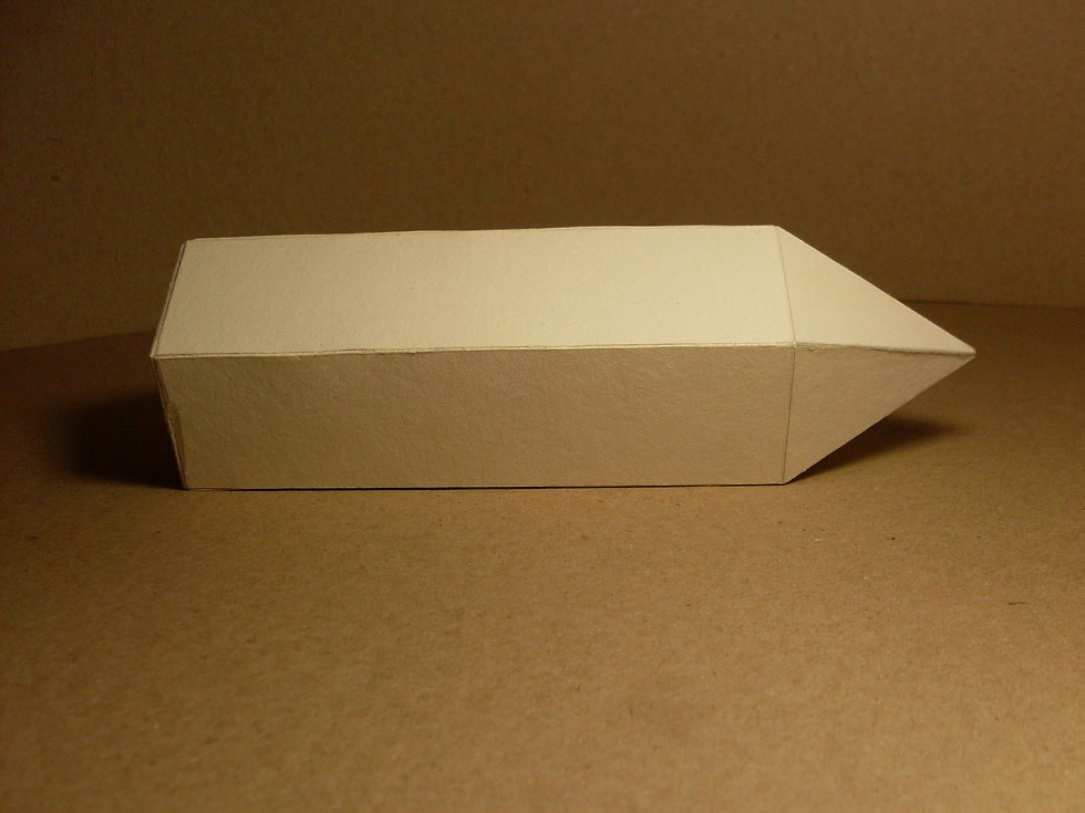 En esta segunda etapa se realizó un diseño en físico de la forma de un empaque de chocolates, con dimensiones de la base un tercio del valor del largo. Se usó cartón paja y pegante especial (UHU). Se creó a partir de la unión de dos poliedros regulares, la pirámide pentagonal y el prisma. Se dibujaron los polígonos que contienen los lados para cada poliedro y se recortó el contorno quedando la silueta de las caras y aristas, luego se generaron cortes por las aristas para poder doblar el polígono y empezar a formar las formas tridimensionales. Luego se pegaron las aristas restantes hasta cerrar toda la forma y tener poliedros completos. Al final se unió la base de la pirámide con la base del prisma.
